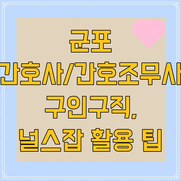 군포에서 간호사/간호조무사 자리 찾고 계신가요? 널스잡 활용 꿀팁 대방출! 이력서 작성, 면접 노하우, 군포 지역 의료계 동향까지 몽땅 알려드릴게요! 경력직, 신입 모두 주목~! 군포 간호사, 군포 간호조무사, 널스잡, 간호 구인구직, 이력서, 면접, 연봉, 병원, 취업, 군포 병원, 요양병원, 한방병원 등 핵심 키워드로 여러분의 취업 성공을 응원합니다! 자, 그럼 시작해 볼까요~?!